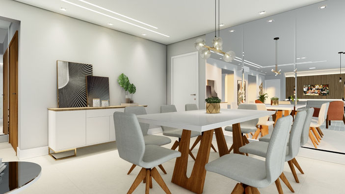 Para transparecer uma sensação de maior amplitude para essa Sala de Estar que é contigua a de Jantar, foi pensado na utilização da cor Off White. Essa tonalidade de branco foi escolhida para trazer um toque moderno ao projeto, além de conceder um aspecto mais clean, que ajuda na iluminação do ambiente, juntamente com faixas de led presentes no forro. Para realçar ainda mais essa solução, instalou-se uma parede de espelhos para "aprofundar" a sala, gerando uma ilusão de grandeza.